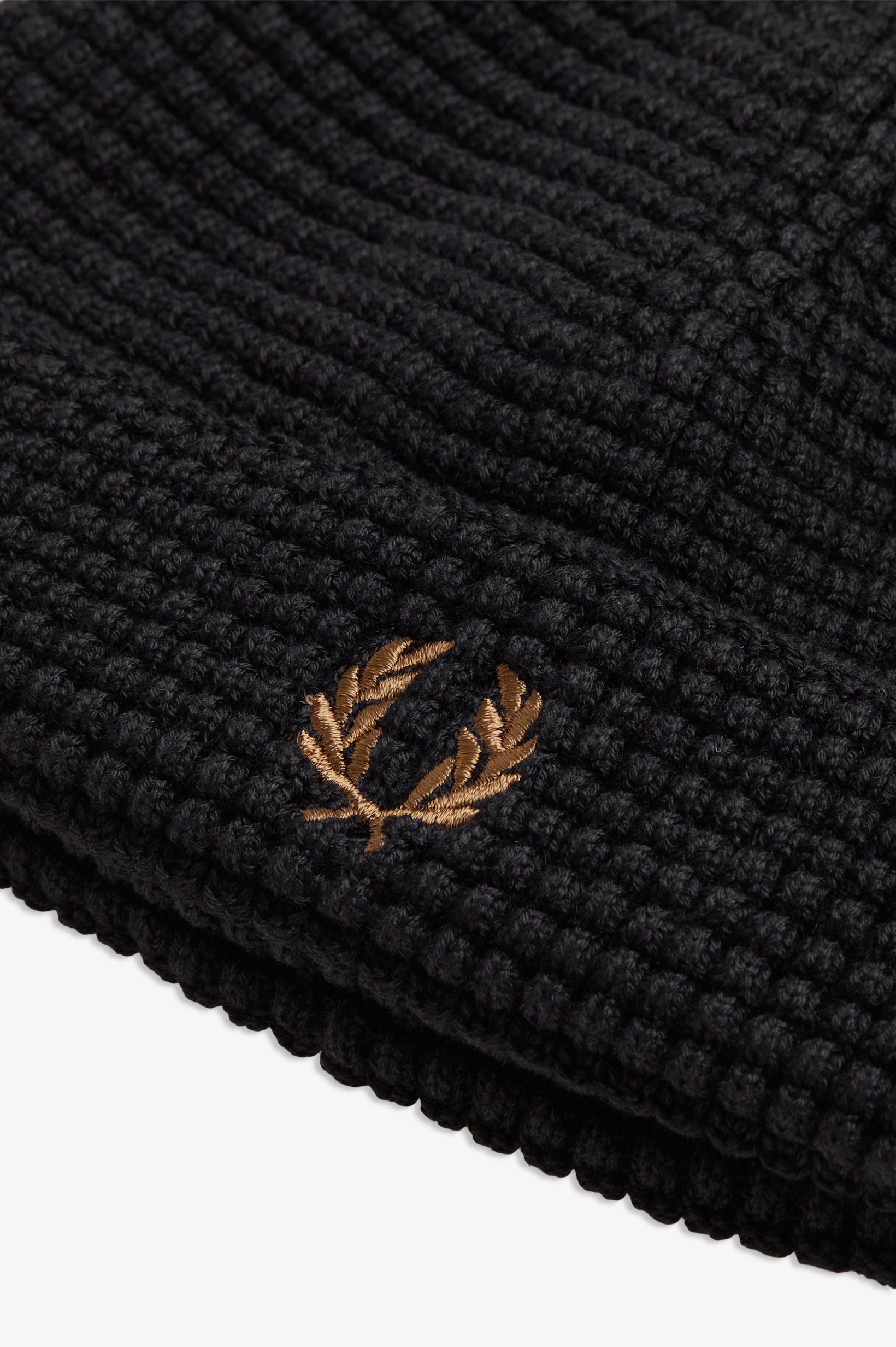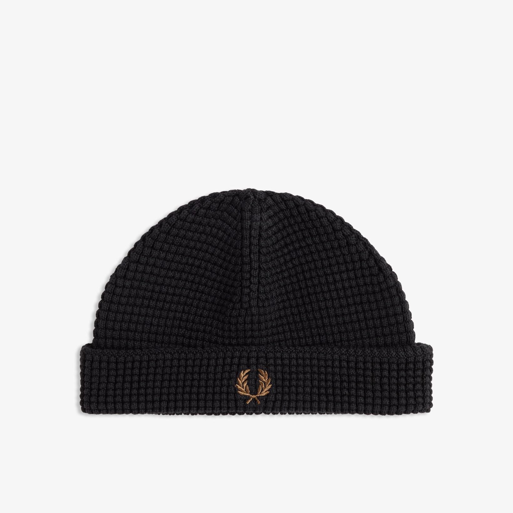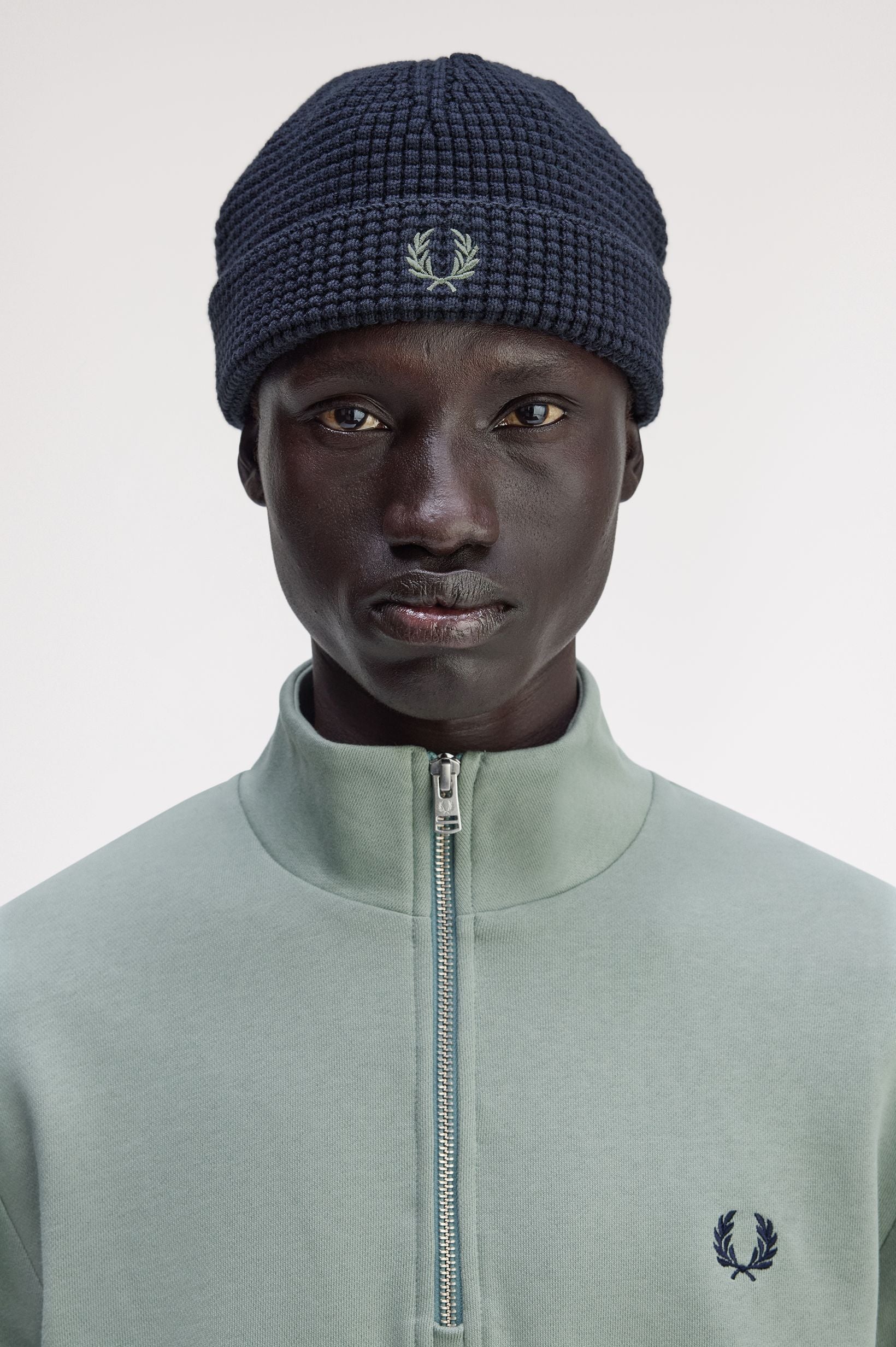 Die Mütze ist aus einem Baumwoll-Poly-Mischgewebe mit unverwechselbaren Fred Perry Details. Das Strickdesign mit Waffelstruktur macht das doch sportliche Beanie zum eleganten Hingucker. Der 15% Polyamid-Anteil sorgt für Elastizität und Strapazierfähigkeit.