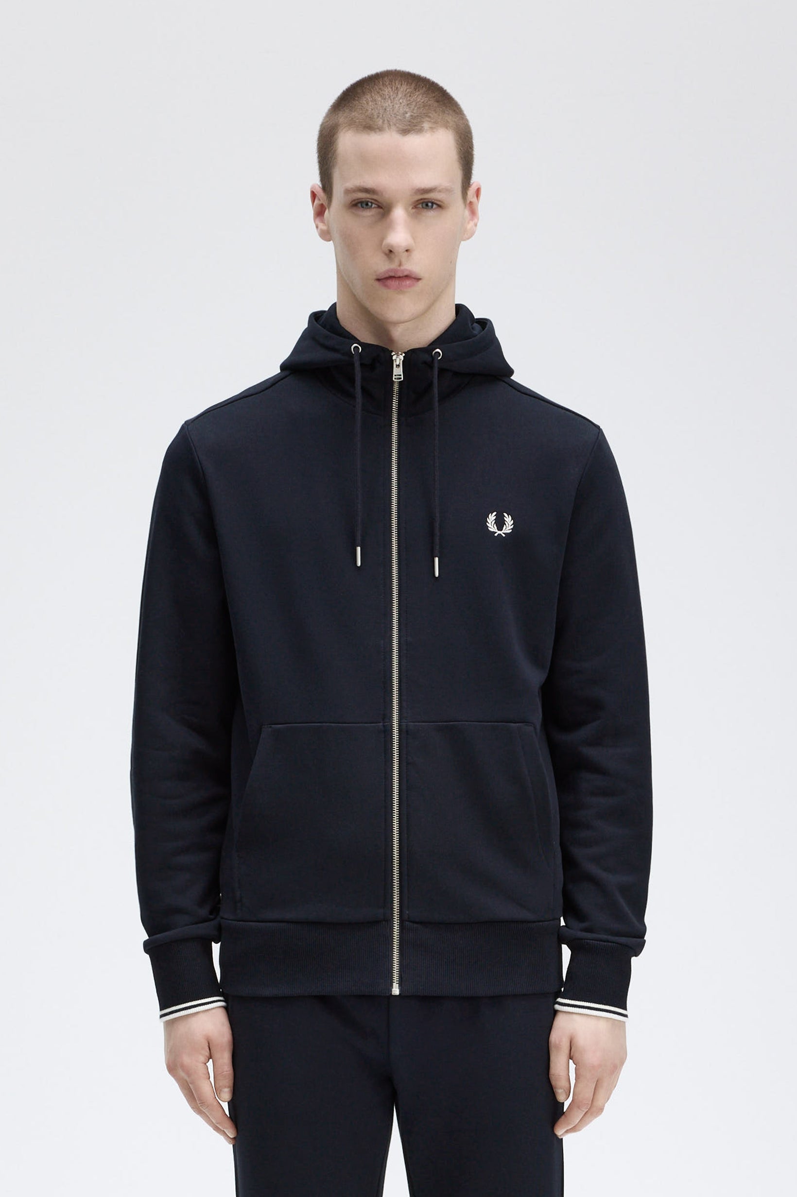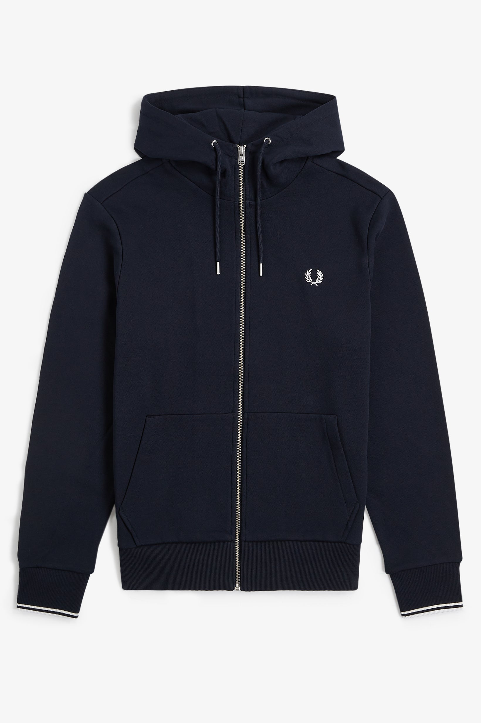 Die Hooded Zip Trough Sweatjacke von Fred Perry - eine klassische Trainingsjacke mit Kapuze - modern und zeitlos.