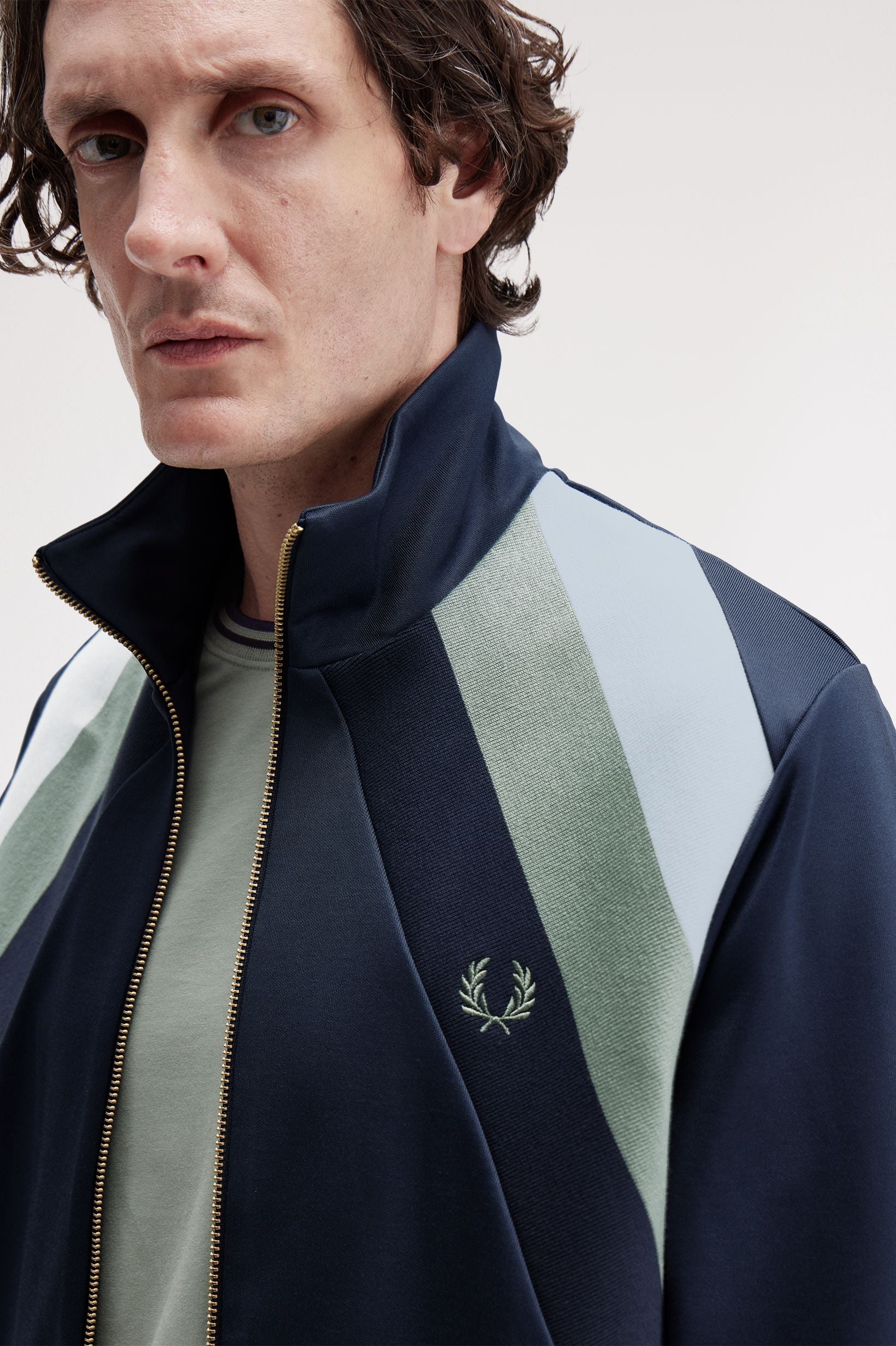 Wir betrachten die Trainingsjacke mal von einem anderen Blickwinkel. Flache Strickeinsätze an der oberen Brust imitieren den Winkel eines Raglanärmels – ein über die Schulter reichender Schnitt, der bei Sportbekleidung für volle Bewegungsfreiheit sorgt. Der Streifen repräsentiert eine tragende Säule des Fred Perry-Looks, während sich ein goldfarbener Reißverschluss und ein Trichterkragen sportlich und dennoch raffiniert anfühlen. Na dann: Spiel, Satz und Sieg!